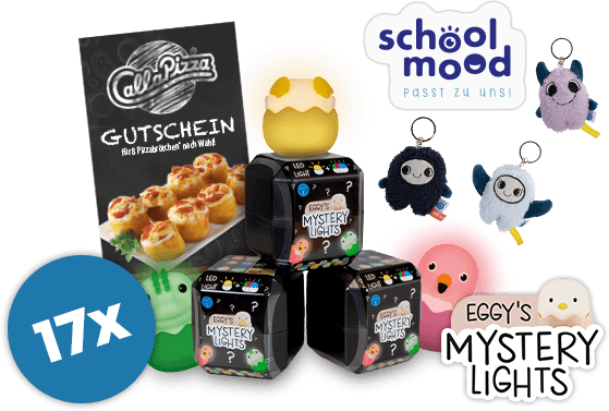 bestehend aus einem Mystery Light von Eggy & Friends, einen Moodie-Schlüsselanhänger von School-Mood und einen Call a Pizza Gutschein für Chicken Nuggets oder eine Kids Box!